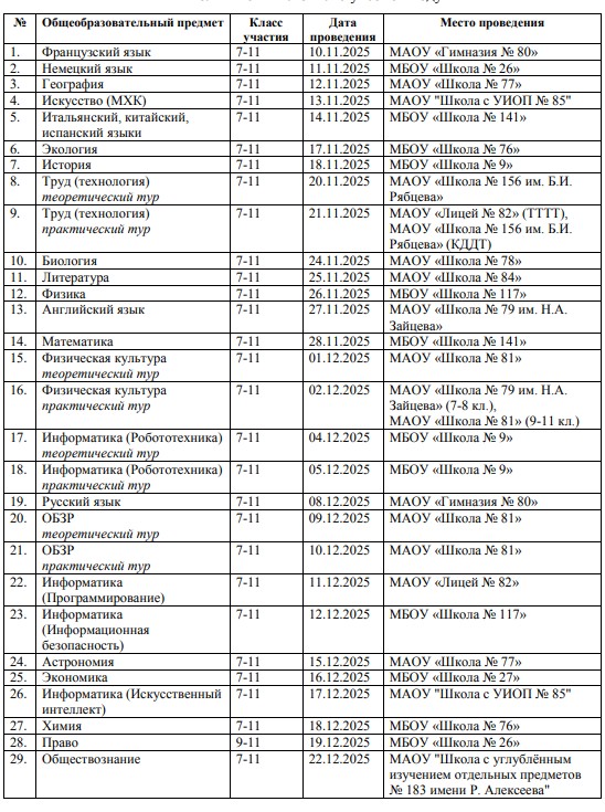 График муниципального этапа муниципального этапа всероссийской олимпиады школьников в 2025-2026 учебном году